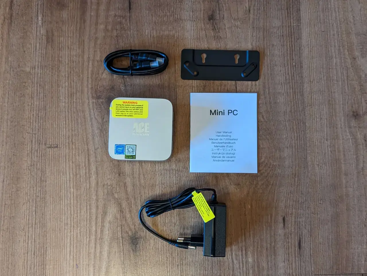 Der Ace Magician T8 Pro wird in einer Karton-Box geliefert, die wirklich klein ist. Da fragt man sich, wo in dieser Verpackung der PC sein soll. Dieser ist so kompakt, da kann man fast schon winzig zu sagen. Und das ist er dann auch, man könnte es glatt für ein Spielzeug halten! Im Karton befinden sich ein Benutzerhandbuch, ein Netzteil (mit Netzkabel), ein HDMI-Kabel und natürlich der Mini-PC selbst. Das war es auch schon.