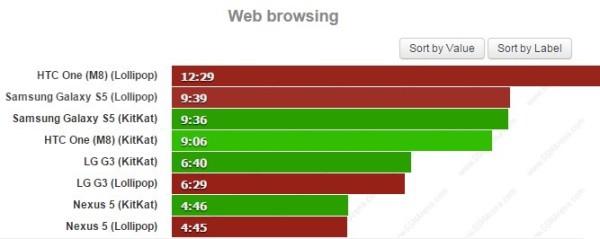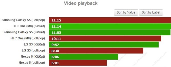 In dem Akku-Test wurden das Nexus 5, das Samsung Galaxy S5, das LG G3 und das HTC One M8 mit Android 5.0 Lollipop ausgestattet und danach die Ergebnisse mit den vorherigen von Android 4.4 KitKat Akkutests verglichen. Während das Samsung Galaxy S5 und das HTC One M8 sich doch verbessern konnten, zicken gerade die beiden LG-Smartphones rum. Während beim LG G3 die Unterscheide zwischen Android Lollipop und KitKat eher marginal sind, fallen diese beim Nexus 5 doch leider deutlicher aus.