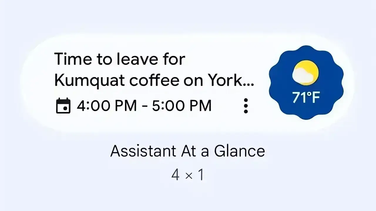 Jetzt gibt es eine umfassende Überarbeitung des At a Glance-Widgets. Das Wetter wird in einer M3-Form auf der rechten Seite angezeigt, vermutlich im Einklang mit dem Dynamic Color-Thema. Erinnerungen scheinen dann den größten Teil des Widgets zu dominieren und uns darüber zu informieren, wann wir zu einem bestimmten Termin aufbrechen müssen.