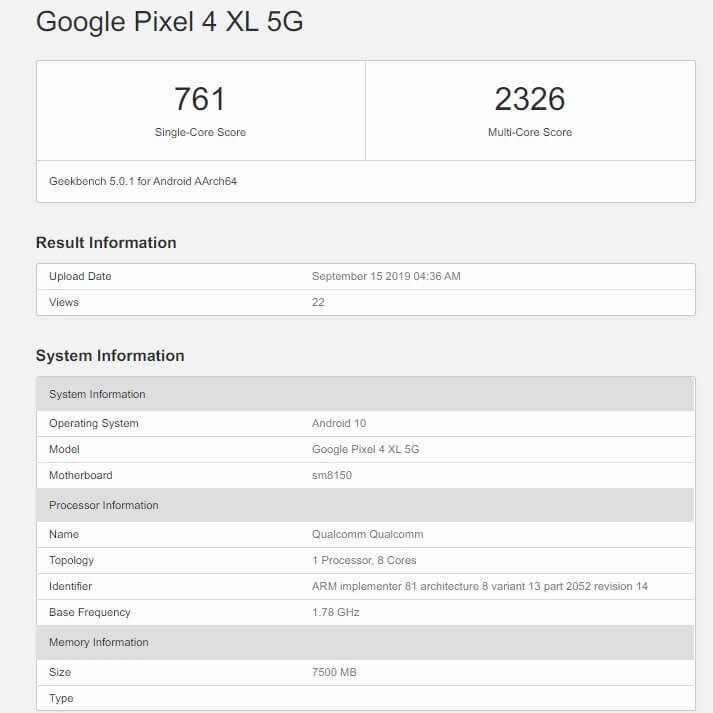 Schon vor ein paar Tagen tauchte ein Pixel 4 XL mit 8 GB RAM auf. Nun erneut, und nun scheint man auch genau zu wissen, dass es sich dabei um die 5G-Modellvariante des größeren Pixel-Modells handelt.