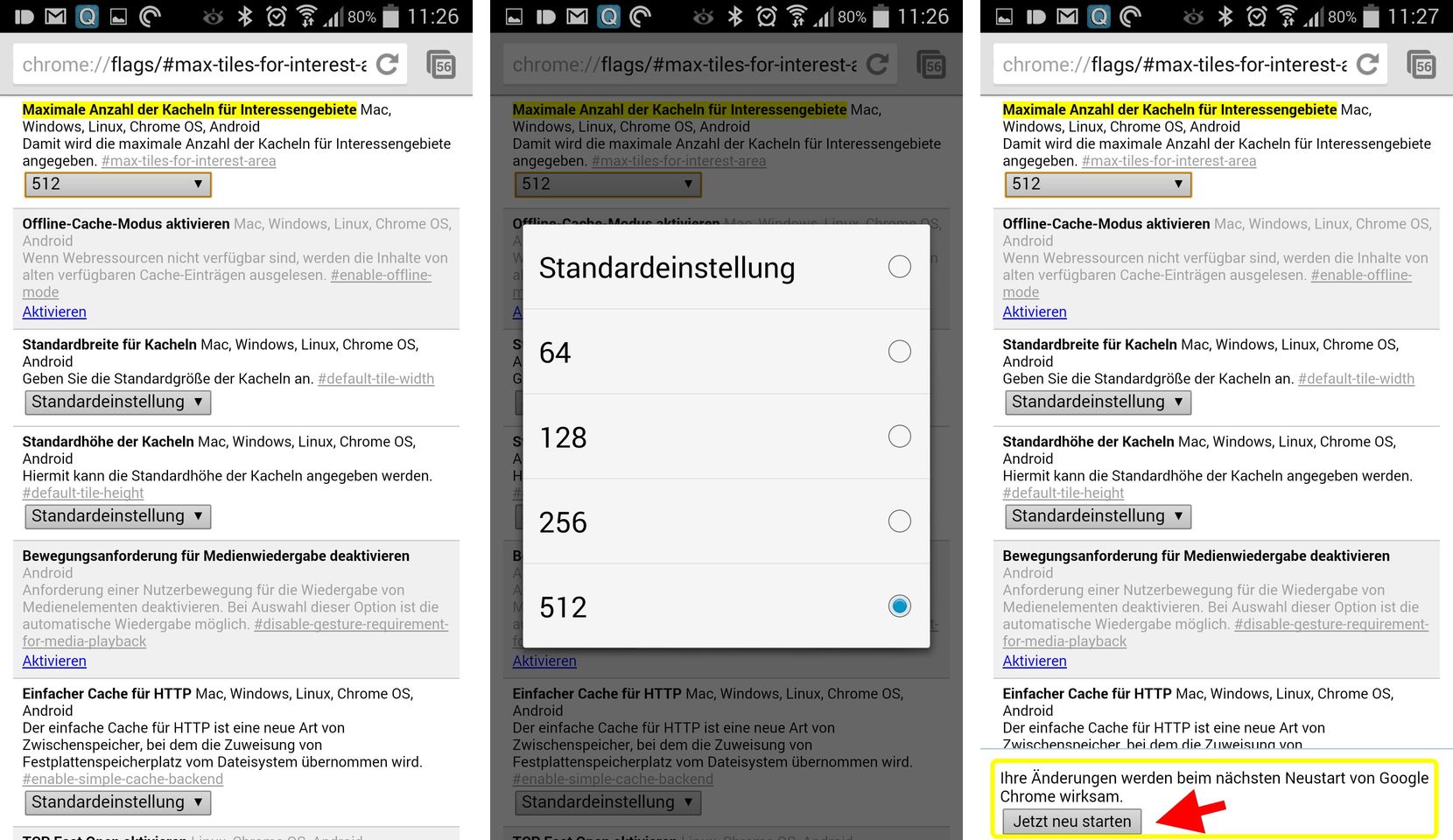 Dort erscheint dann ein Dropdown Menü, bei welchem ihr dann einfach 512 auswählt und dann auf „neu starten“. Und dies bewirkt dann, dass mehr Arbeitsspeicher für Chrome für Android reserviert wird. Bei größeren Webseiten werden so vorab bereits mehr Elemente in den Arbeitsspeicher geladen.