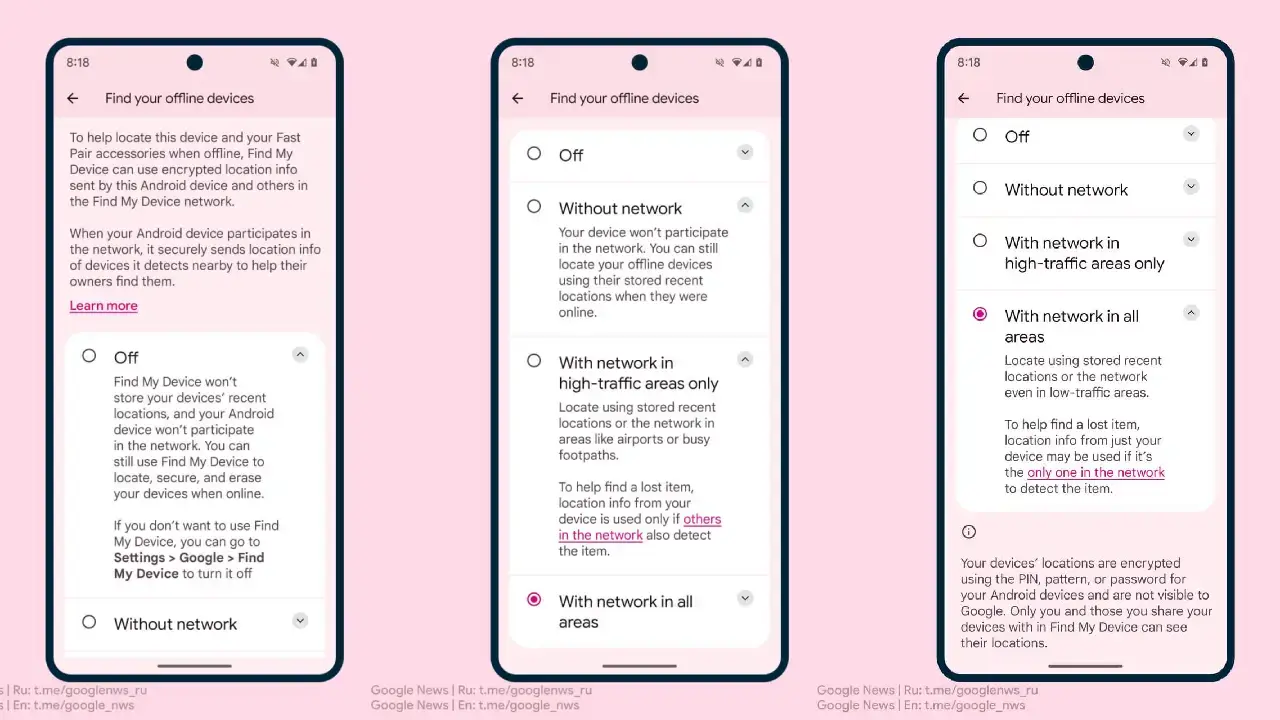 Die Einstellungsseite der neuen Funktion „Find My Device Network“ bietet Benutzern vier Optionen zur Auswahl, abhängig von ihren Vorlieben und Datenschutzbedenken.