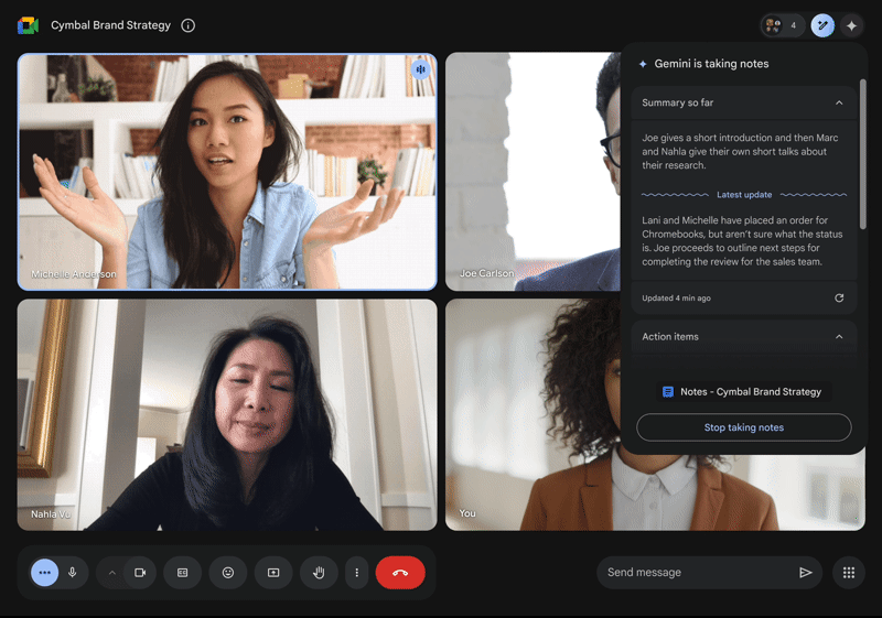 Mit der neuen Funktion „Notizen für mich machen“ in Google Meet vergisst du nie wieder wichtige Punkte aus Meetings. Gespräche werden automatisch transkribiert und du kannst dich ganz auf die Besprechung konzentrieren. Mit „Für mich übersetzen“ in Google Meet werden Untertitel in 69 Sprachen in Echtzeit generiert. So kannst du mit Menschen aus aller Welt zusammenarbeiten, ohne Sprachbarrieren.