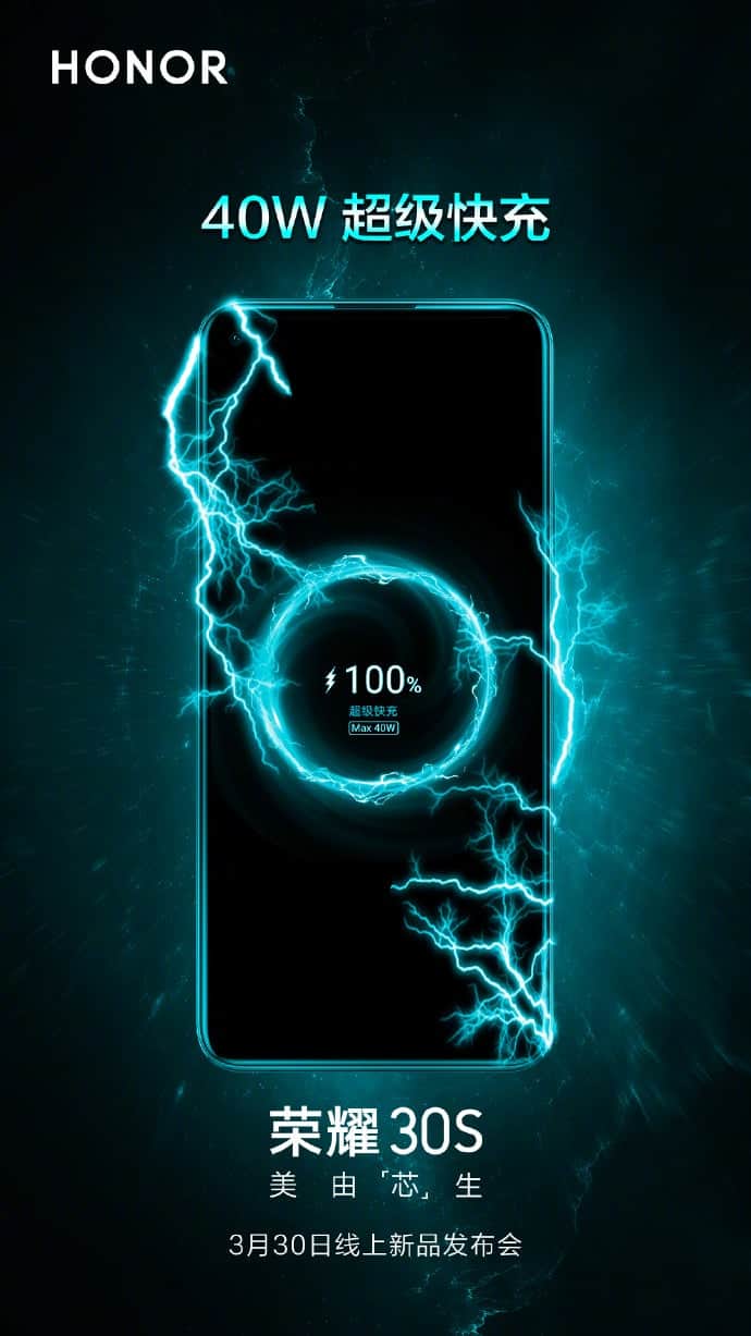 Die neuen Teaserposter verraten außerdem, dass das Honor 30S mit 40 Watt schnell geladen werden kann. Damit ist nun auch Honor bei den ganz Schnellen mit dabei.