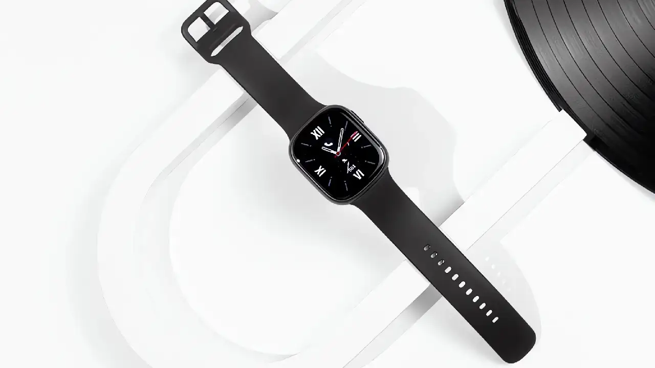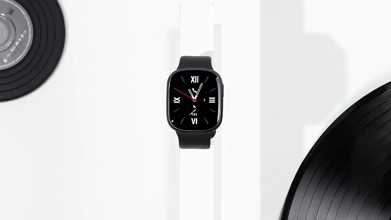 Die Bilder zeigen die quadratische Uhr mit elegant abgerundeten Ecken. Die Uhr scheint es in den Farboptionen Schwarz, Gold und Silber zu geben. Das Display ist an allen vier Seiten leicht abgerundet, was zu einem optisch ansprechenden 2,5-D-Panel führt.