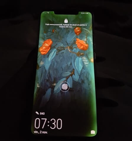 „Das Mate 20 Pro verwendet einen branchenführenden flexiblen OLED-Bildschirm mit speziell gewölbten Kanten für ein verbessertes Seherlebnis und verbesserten Bedienkomfort. Dies kann bei unterschiedlicher Betrachtung zu leichten Verfärbungen führen.