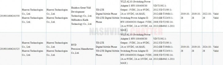 Die 3C-Eintragung des Huawei Nova 6 4G zeigt, dass das Telefon mit dem Adapter HW-100400C00 geliefert wird. Dieser unterstützt die 40W Ladegeschwindigkeit. Die Eintragung enthüllt aber keine weiteren Details über das Gerät.