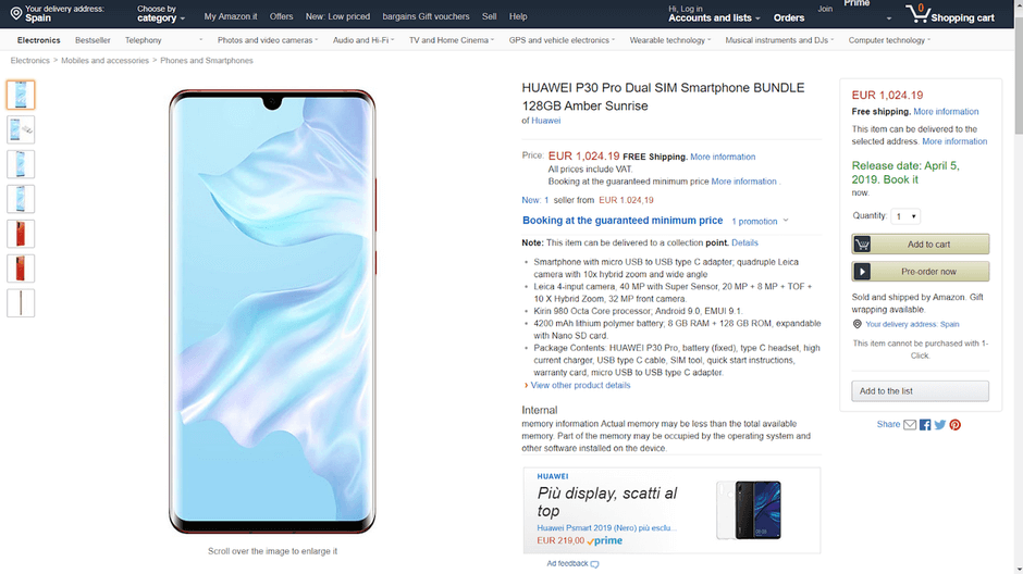 Bei Amazon hat jemand zu früh auf den Knopf gedrückt. Kurzzeitig war dort das neue Huawei P30 Pro bereits gelistet. Laut der italienischen Dependance soll das neue Flaggschiff ab dem 5. April verfügbar sein. Das wäre nur knapp 1,5 Wochen nach der Vorstellung.