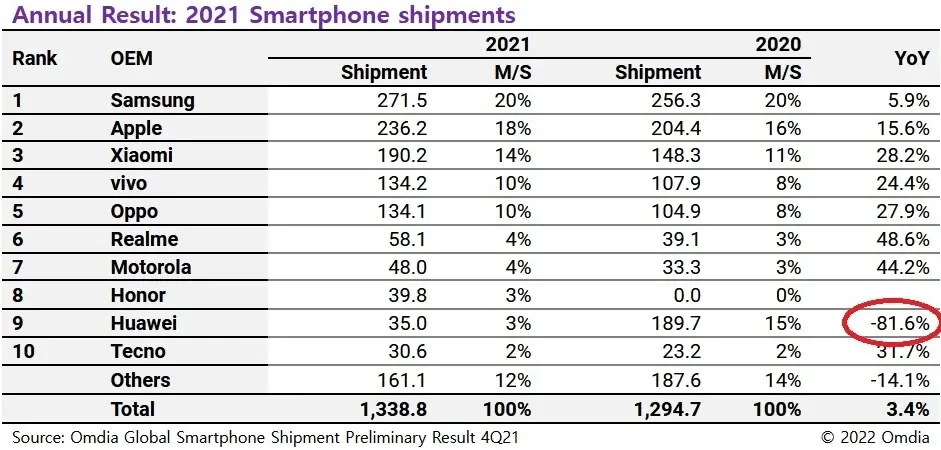 Infolgedessen sank die Zahl der von Huawei im Jahr 2021 ausgelieferten Mobiltelefone nach Angaben von Omdia um 81,6 Prozent auf 35 Millionen Stück. Der weltweite Marktanteil von Huawei fiel von 15 Prozent im Jahr 2020 auf nur 3 Prozent im Jahr 2021. Aus denselben Daten geht hervor, dass Honor als unabhängiges Unternehmen 39,8 Millionen Geräte ausgeliefert hat und damit an achter Stelle liegt, einen Platz vor Huawei. Beide Unternehmen hatten im vergangenen Jahr einen Anteil von 3 Prozent am weltweiten Smartphone-Absatz.