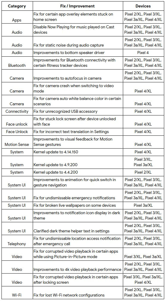Ab sofort stehen die neuen 10.0.0-Dateien für das Pixel 4 und Pixel 4 XL (QQ2A.200305.003, QQ2A.200305.004.A1), Pixel 3a und Pixel 3a XL (QQ2A.200305.002), Pixel 3 und Pixel 3 XL (QQ2A.200305.002) sowie Pixel 2 und Pixel 2 XL (QQ2A.200305.002) zum Download zur Verfügung.
