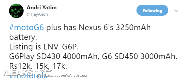 Das Motorola Moto G6 soll von einem Qualcomm Snapdragon 450 angetrieben werden, das Moto G6 Plus von einem Qualcomm Snapdragon 630 und beim Moto G6 Play der Qualcomm Snapdragon 430. Die Displaygrößen wachsen auf 5,7″ bzw. 5,93″. Als Arbeitsspeicher kommen in den Modellen 3 GB RAM zum Einsatz, der interne Speicher soll wohl 32 GB groß sein. Auf der Rückseite sind jeweils Dual-Kameras verbaut, über dessen Auflösung noch nichts bekannt ist. Im neuen Moto G6 Play soll der Akku eine Kapazität von 4.000 mAh besitzen, im Moto G6 dagegen 3.000 mAh und im Moto G6 Plus 3.250 mAh. Im zweiten Quartal 2018 sollen die Modelle erhältlich sein.