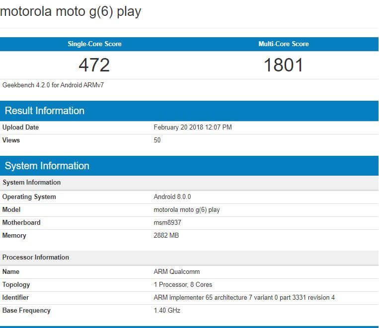 Einen 360° Rundum-Blick konnten wir ja bereits auf das Motorola Moto G6 Play in einem Video werfen. Nun zeigt es sich im Geekbench und hat ein paar Spezifikationen parat. Die meisten davon waren aber bereits bekannt. Und so können wir mal einen Blick auf die Ergebnisse des Motorola Moto G6 Play im Benchmark nehmen. Ein Geschwindigkeits-Wunder erwartet uns jedenfalls nicht. So kommt das Smartphone im Single-Core auf 472 Punkte und im Multi-Core auf 1.801 Punkte. Das sind doch schon riesige Unterschiede zu den neuen Flaggschiffen. Aber hier ist auch nur der Qualcomm Snapdragon 430 verbaut, dieser ist eben für Einsteiger-Smartphones konzipiert worden.