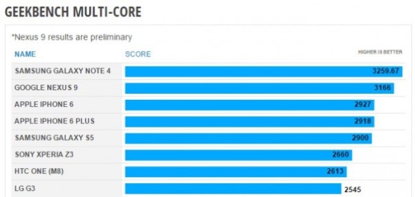 Im Multicore-Test hingegen muss sich das Nexus 9 eben jenem Samsung GALAXY Note 4 geschlagen geben, auch wenn nur knapp. Jedoch sollte man bedenken, dass Samsung’s neues Flaggschiff auch viermal so viele Kerne hat wie das Tablet. Jedoch wird auch hier das hochgelobte neue Apfel-Phone wieder abgehängt. Es scheint also so, ab ob dessen Vormachtstellung beendet sei.