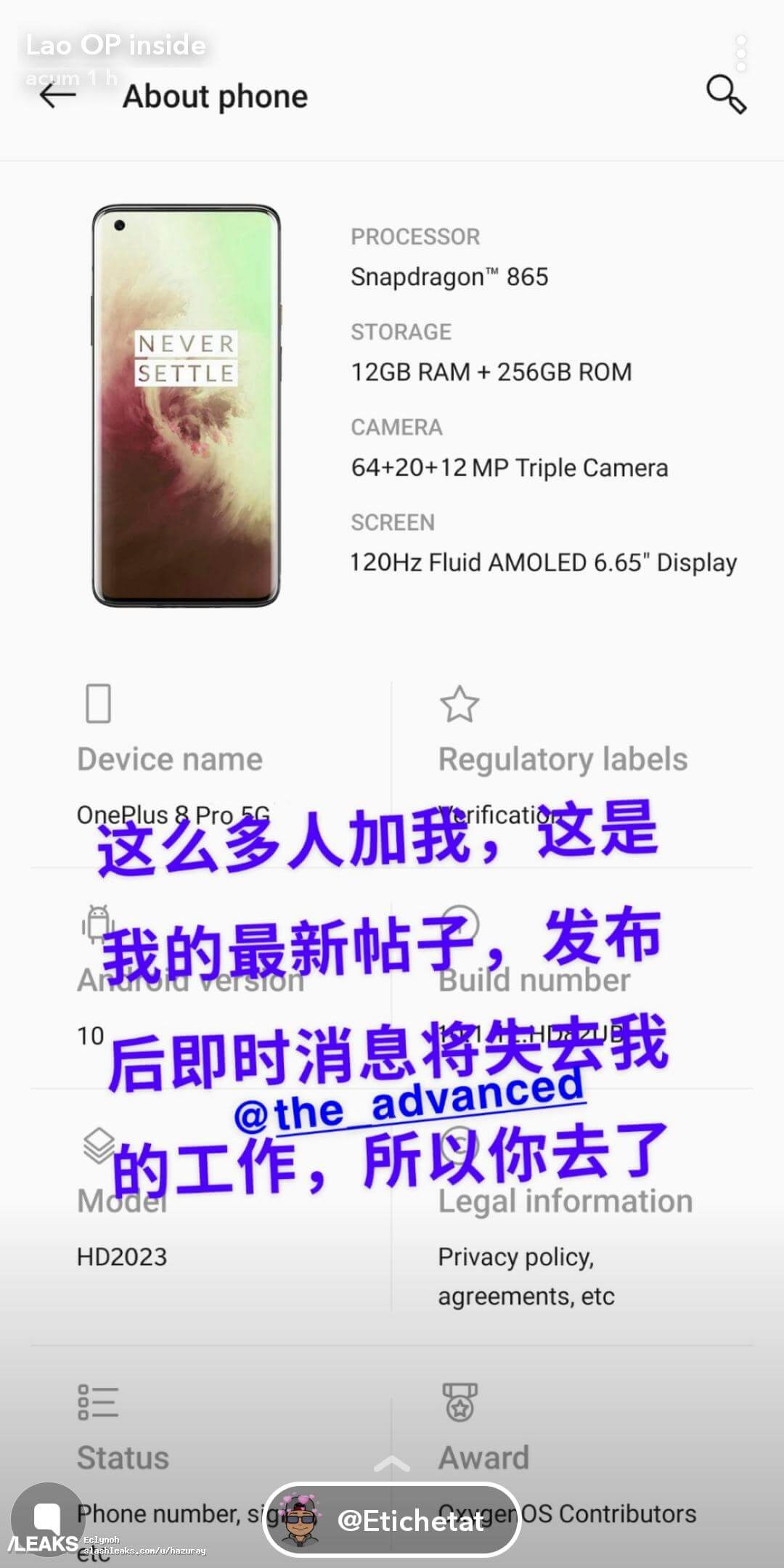 Falls es sich um keinen Fake handelt, dann können wir beim OnePlus 8 Pro mit einem 6,65″ 120 Hz-Display rechnen. Im Inneren wird logischerweise der Qualcomm Snapdragon 865 verbaut sein, eine Version mit 12 GB RAM und 256 GB Speicher können wir erwarten.