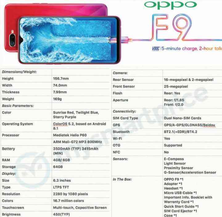 Demnach soll das Oppo F9 mit einen 6,3″ IPS-Display mit 2.280 x 1.080 Pixeln Auflösung erscheinen. Im Inneren soll der 2 GHz MediaTek Helio P60 Octa-Core-Prozessor nebst ARM Mali-G72 GPU werkeln, dieser soll wahlweise von 4 GB oder 6 GB RAM unterstützt werden. Der interne Speicher soll 64 GB groß sein.