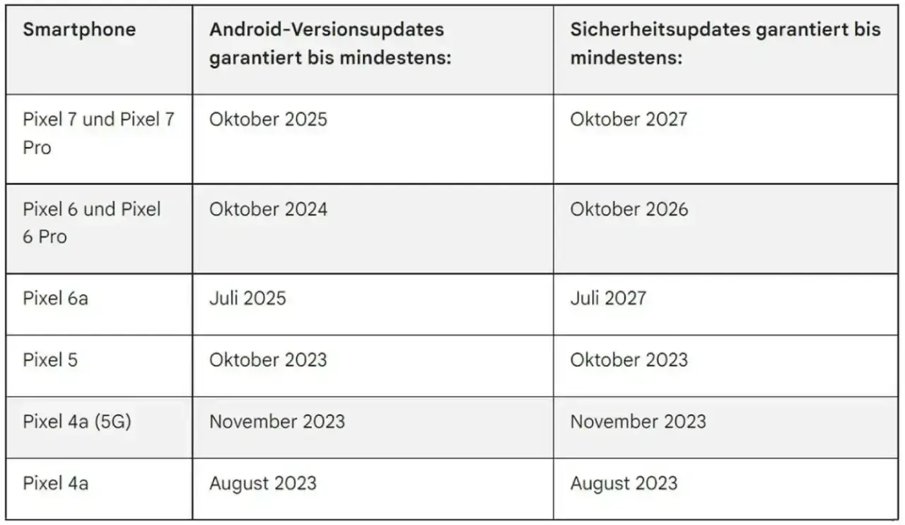 Google Pixel 6, Pixel 6 Pro, Pixel 6a, Pixel 7 und Pixel 7 Pro erhalten mindestens fünf Jahre lang Updates, nachdem das Gerät zum ersten Mal im Google Store USA eingeführt wurde. Zu diesen Updates gehören u. a. Sicherheits- und Softwareupdates sowie neue Funktionen.