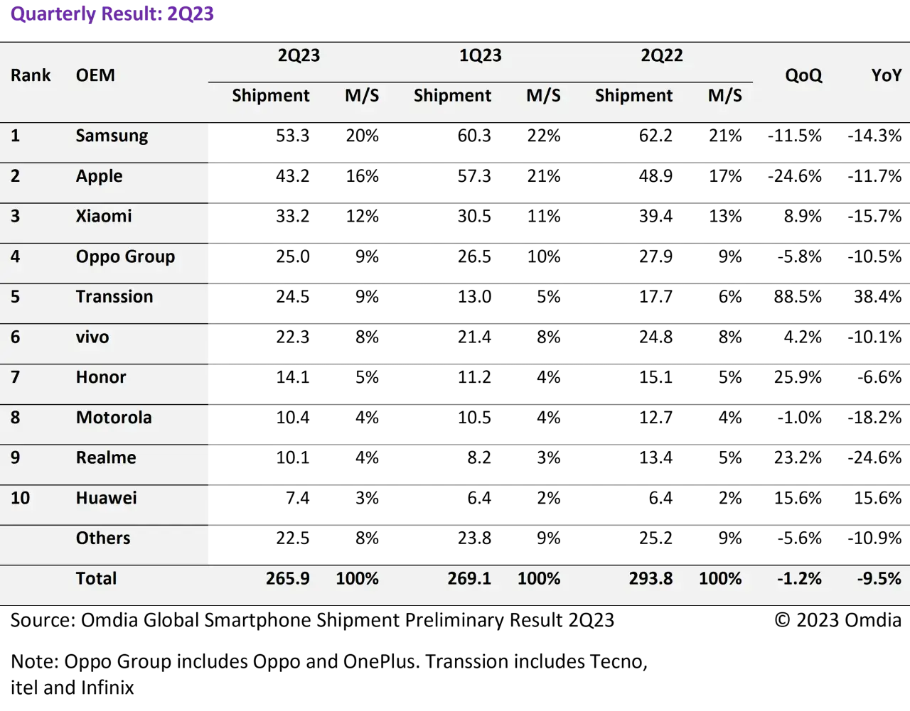 Die weltweiten Auslieferungen von Xiaomi gingen weiter zurück auf 33,2 Millionen, was einem Rückgang von 15,7 Prozent gegenüber dem Vorjahr entspricht. Die Oppo-Gruppe (einschließlich OnePlus) verzeichnete im 1. Quartal 2023 25,0 Millionen Auslieferungen, was einem Rückgang von 10,5 Prozent gegenüber dem Vorjahr entspricht.