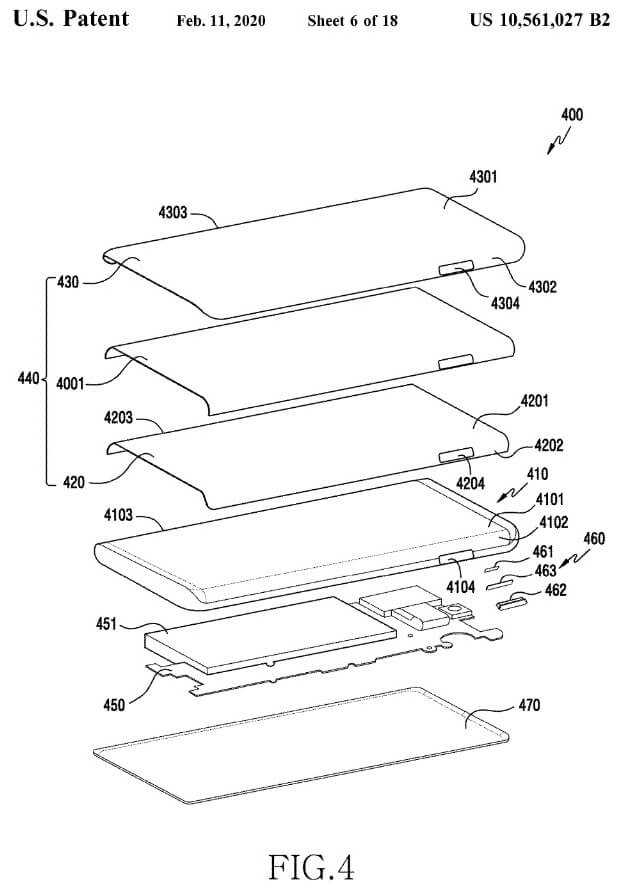 Dieses Design-Patent zeigt ein Waterfall-Display und an den Seiten Buttons, die durch das Display hindurch verbaut sind. Außerdem wird in dem Patent auch von Sensoren für EKG oder EEG sowie von einem holografischen Projektor gesprochen.