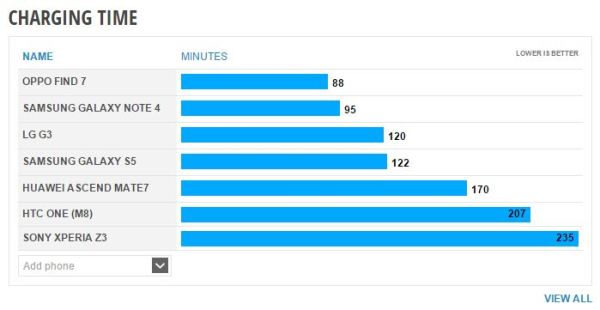 Auch beim Aufladen macht das neue Samsung GALAXY Note 4 eine richtig gute Figur. In nur 95 Minuten ist der Akku des Smartphones wieder komplett geladen. Auch dieser Wert ist sehr beeindruckend. Hier schon sich nur das OPPO Find 7 vor das neue Samsung Flaggschiff.