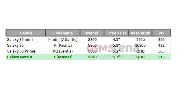 Die von den Samsung-nahe stehenden Quellen gelieferte Tabelle listet das Samsung GALAXY Note 4 als SM-N910 mit dem Codenamen T (Muscat) und einem 5,7″ Display mit QHD-Auflösung mit 2.560 x 1.440 Pixeln Auflösung. Das entspricht einer Pixeldichte von 515ppi.