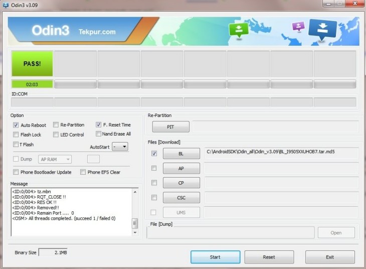 - nach dem Neustart das Samsung Galaxy S4 ausschalten und im Download-Modus starten, Odin 3.09 auf dem PC starten und die Bootloader-Datei in das Feld BL eintragen.
