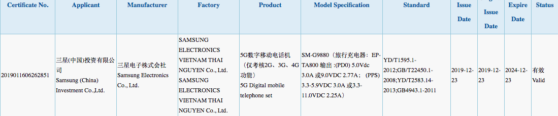 Wie auf dem Bild der 3C-Zertifizierung zu sehen ist, wird das Samsung Galaxy S11+ (mit der Modellnummer SM-G9880) mit 25W Schnellladung ausgestattet sein. Ansonsten verrät die Zertifizierung nicht viel über das Gerät.