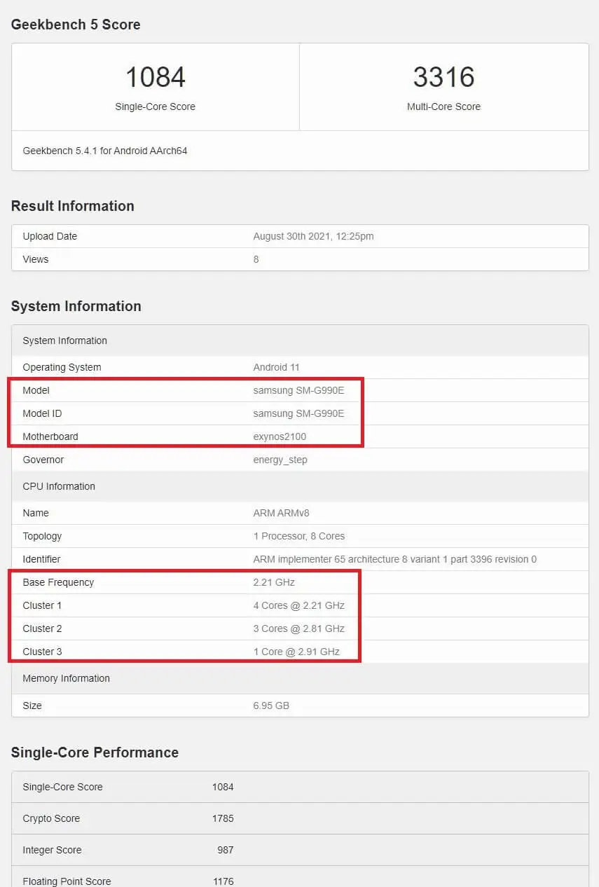 Laut dem Geekbench-Eintrag trägt das Handy die Modellnummer SM-G990E und ist mit dem Exynos 2100 ausgestattet, wie man auf dem Eintrag im Benchmark sehen kann.