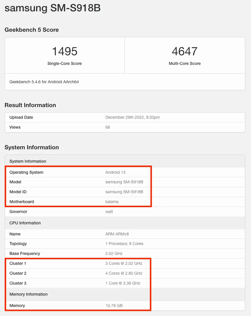 Das Samsung Galaxy S23 Ultra dürfte auch hier mit dem Samsung-exklusiven Snapdragon 8 Gen 2-Chipsatz auf getestet worden sein. Dieser soll ja mehr Leistung haben als der Standard-SoC, der in anderen Modellen der Konkurrenz verbaut wird.