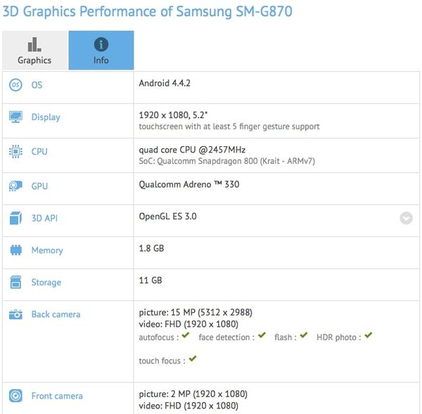 Laut dem Eintrag in der Datenbank von GFXBench soll das Samsung GALAXY S5 Active über ein 5,2″ FullHD-Display verfügen. Angeblich soll in diesem Modell aber nur ein etwas älterer Qualcomm Snapdragon 800 werkeln, dies könnte auf einen günstigen Preis hindeuten. Oder nur ein Vorserienmodell mit noch nicht finaler Ausstattung.