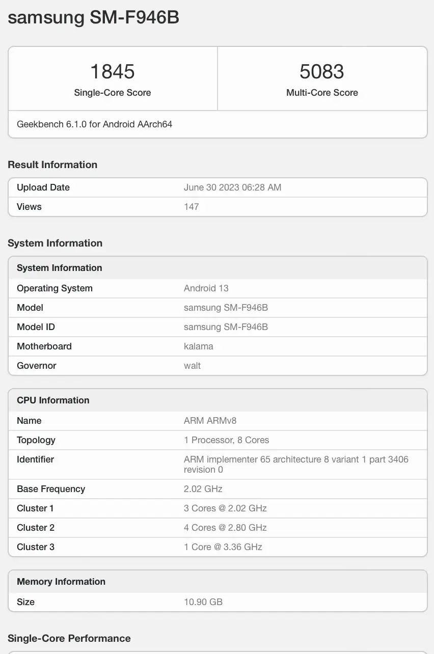 Und so kam das Samsung Galaxy Z Fold 5 im GeekBench 6 auf eine Punktzahl von 1.845 Punkten im Single-Core-Test und 5.083 Punkte im Multi-Core-Test.
