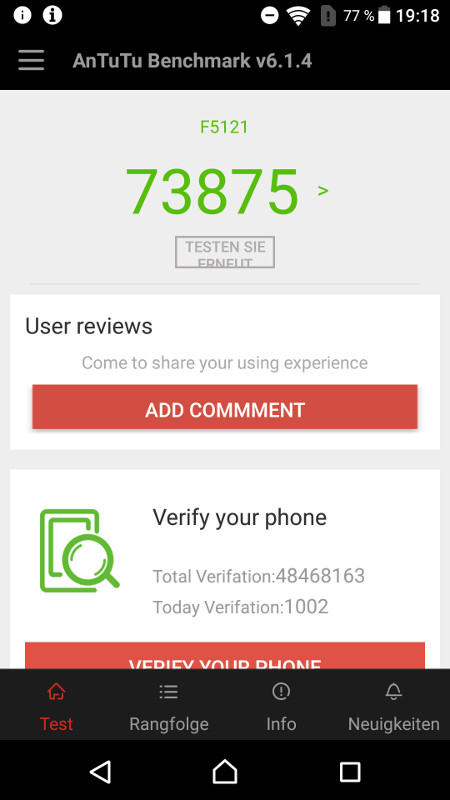 Das Sony Xperia X lag den Jungs von inside-handy.de bereits zum testen vor. Und sie haben das Modell nun einem ersten Benchmark-Test unterzogen. Dafür wurde das Sony Xperia X durch den AnTuTu 6.1.4 gejagt. Natürlich kann es nicht mit den Top-Smartphones mithalten, hier ist ja auch nur ein Qualcomm Snapdragon 650 verbaut. Dennoch erzielt das Modell im Test einen ordentlichen Wert von 73.875 Punkten. Dies dürfte mehr als ausreichend sein für den Otto-Normal-User. Denn damit ist es ungefähr so schnell wie das Nexus 6P (79.403 Punkte). Und das ist ja auch nicht gerade langsam. Ruckeln tut eh nix bei einem solchen Wert, alles läuft flüssig. In der Mittelklasse gibt das Sony Xperia X damit auch den Ton an.