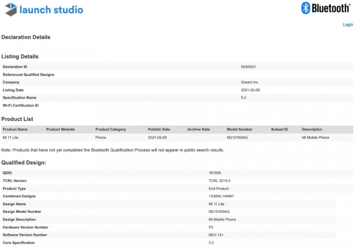Jetzt ist Xiaomi’s Mi 11 Lite-Modell auf der Bluetooth SIG-Website aufgetaucht und bestätigt, dass das Gerät tatsächlich in der Entwicklung ist. Die Auflistung wiederholt auch die zuvor gesichtete Modellnummer M2101K9AG, wobei das „G“ am Ende auf ein globales/europäisches Gerät hinweist und nicht auf ein chinesisches oder indisches Modell.
