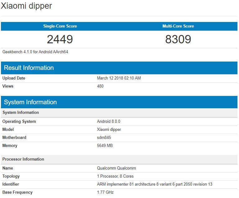 Jetzt hat sich auch das neue Xiaomi Mi 7 im Geekbench gezeigt. Und hinterlässt doch eine deutliche Duftmarke. Denn die erreichten Werte sind schon beeindruckend. Dort zeigt sich das Flaggschiff unter dem Codenamen „Dipper“. einer „Notch“ erscheinen. Im Single-Core erreicht das Xiaomi Mi 7 dort 2.449 Punkte und im Multi-Core 8.309 Punkte. Damit ist das Smartphone ungefähr gleich schnell wie die Qualcomm Snapdragon 845-Version des Samsung Galaxy S9. Mit der Exynos-Version kann es allerdings nicht mithalten.